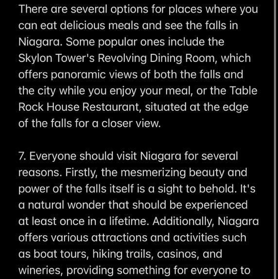 6 Where can you eat delicious meals and see the falls? 7 Why should everyone visit Niagara? 8 Would you like to go there? Why/Why not?СРОЧНО ПОМОГИТЕ ПЖПЖПЖ