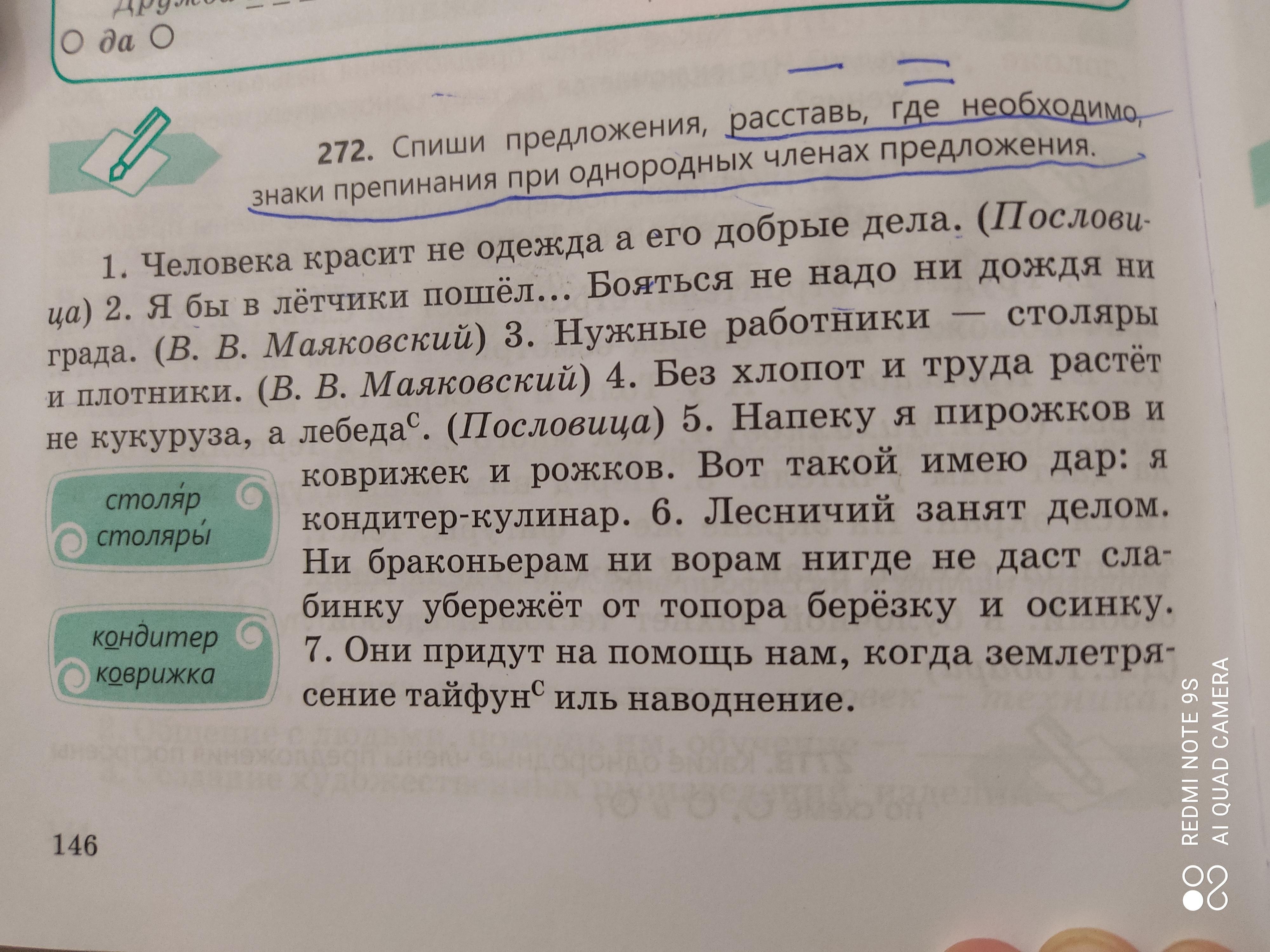 Ответ: 1. Человека красит не одежда, а его добрые дела. 2. Я бы в лётчики пошёл… Бояться не надо ни дождя, ни града. 3. Нужные работники - столяры и плотники. 4. Без хлопот и труда растёт не кукуруза, а лебеда. 5. Напеку я пирожков, и коврижек, и рожков. 6. Лесничий занят делом. Ни браконьерам, ни ворам нигде не даст слабинку, убережёт от топора берёзку и осинку. 7. Они придут на помощь нам, когда землетрясение, тайфун иль наводнение.