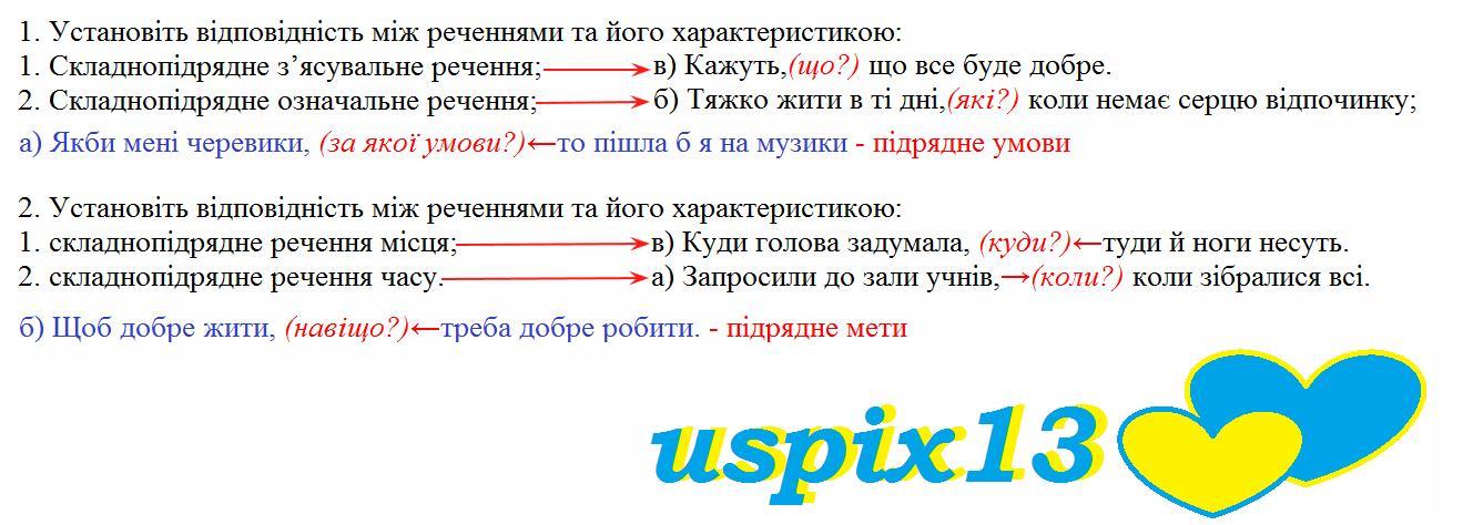 1. Установіть відповідність між реченнями та його характеристикою: 1. Складнопідрядне зʼясувальне речення; 2. Складнопідрядне означальне речення; а) Якби мені черевики, то пішла б я на музики; 6) Тяжко жити в ті дні, коли немає серцю відпочинку; в) Кажуть, що все буде добре. 2. Установіть відповідність між реченнями та його характеристикою: 1. складнопідрядне речення місця; 2. складнопідрядне речення часу. а) Запросили до зали учнів, коли зібралися всі. б) Щоб добре жити, треба добре робити. в) Куди голова задумала, туди й ноги несуть.