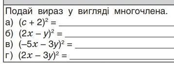 Подай вираз у вигляді многочлена. a) (c + 2)2 = б) (2x - y)2 = B) (-5x-3y)2 = г) (2x-3y)2 =