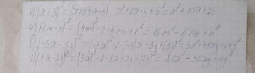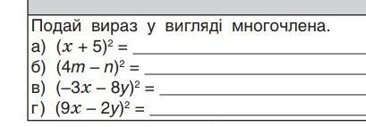 Подай вираз у вигляді многочлена. a) (x + 5)2 = б) (4m - n)2 = в) (-3x - 8y)2 = г) (9x - 2y)2 =
