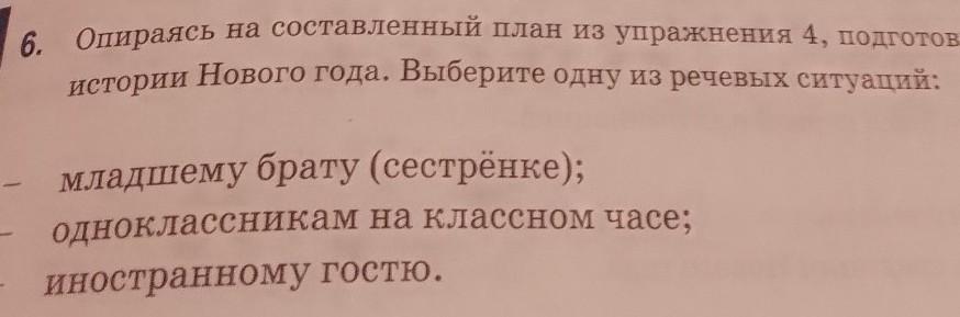 6. - Опираясь на составленный план из упражнения 4, подготое сообщение об истории Нового года. Выберите одну из речевых ситуаций: младшему брату (сестренке); одноклассникам на классном часе; иностранному гостю.
