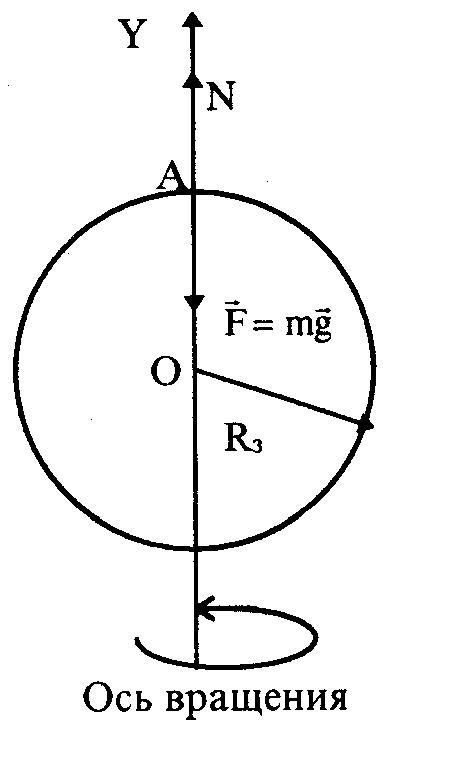 b) При нахождении веса тела на экваторе (точка В) на тело действуют реакция опоры N, сила тяжести Fт = mg, а также центростремительная сила F = m*а, где a центростремительное ускорение, приобретаемое телом за счет вращения Земли вокруг оси.