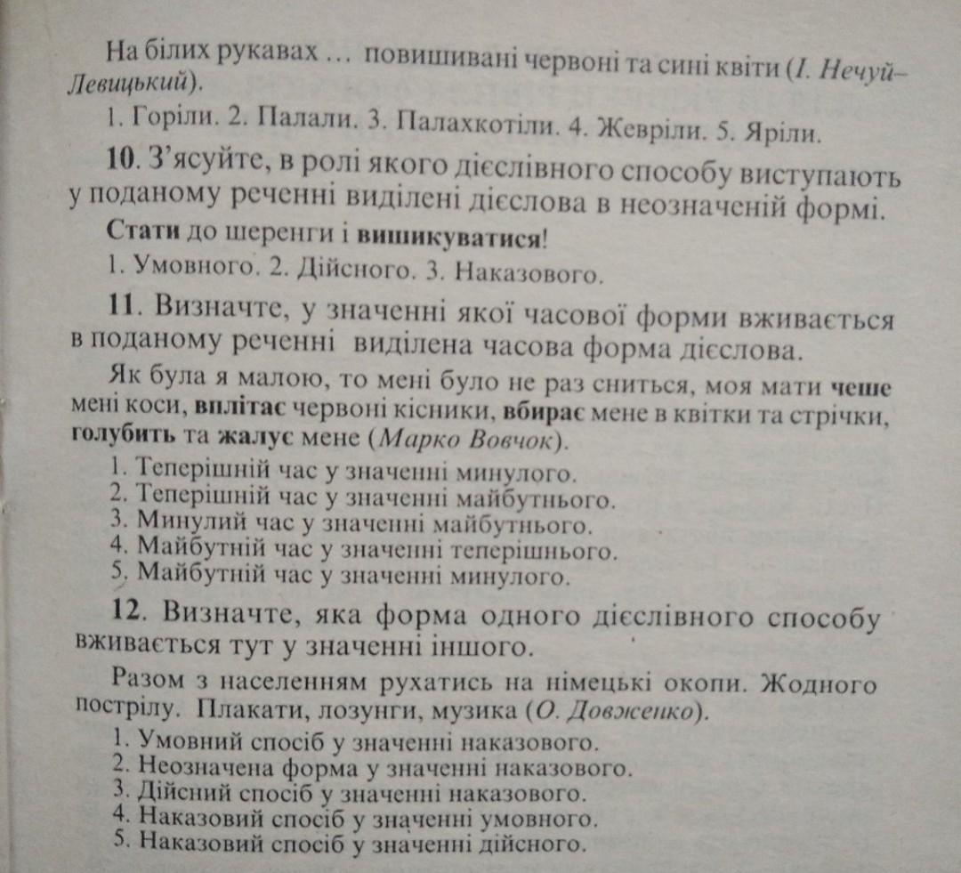 На білих рукавах. повишивані червоні та сині квіти (І. Нечуй- Левицький). 1. Горіли. 2. Палали. 3. Палахкотіли. 4. Жевріли. 5. Яріли. *** 10. З'ясуйте, в ролі якого дієслівного способу виступають у поданому реченні видiленi дiєслова в неозначеній формі. Стати до шеренги і вишикуватися! 1. Умовного. 2. Дійсного. 3. Наказового. 11. Визначте, у значенні якої часової форми вживається в поданому реченні виділена часова форма дієслова. Як була я малою, то мені було не раз сниться, моя мати чеше мені коси, вплітає червоні кісники, вбирає мене в квітки та стрічки, голубить та жалує мене (Марко Вовчок). 1. Теперішній час у значенні минулого. 2. Теперішній час у значенні майбутнього. 3. Минулий час у значенні майбутнього. 4. Майбутній час у значенні теперішнього. 5. Майбутній час значенні минулого. 12. Визначте, яка форма одного дієслівного способу вживається тут у значенні іншого. Разом з населенням рухатись на німецькі окопи. Жодного пострілу. Плакати, лозунги, музика (О. Довженко). 1. Умовний спосіб у значенні наказового. 2. Неозначена форма у значенні наказового. 3. Дійсний спосіб у значенні наказового. 4. Наказовий спосіб у значенні умовного. 5. Наказовий спосіб у значенні дійсного.