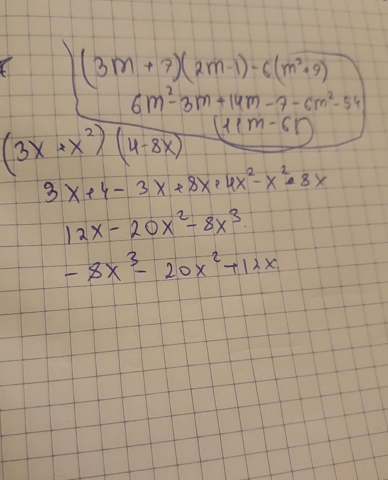 Подайте у вигляді многочлена: 1) (3m + 7)(2m-1)-6(m² + 9) У відповідь записати многочлен.
