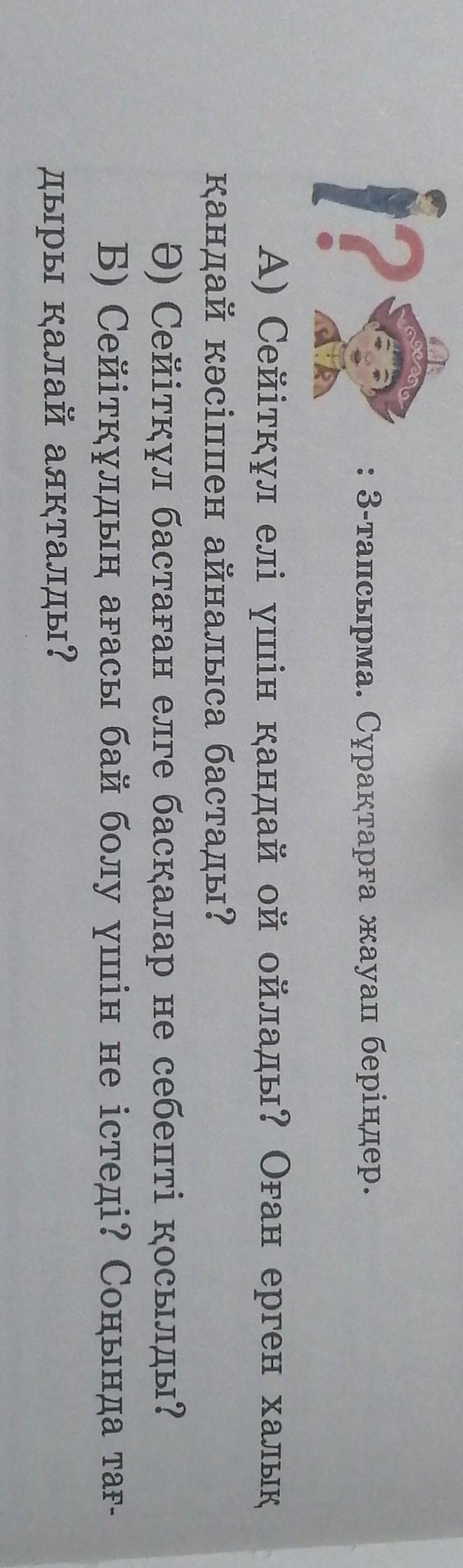 A) Сейіткул елi ушiн кандай ой ойлады? Оған ерген халык кандай кәсiппен айналыса бастады? Ә) Сейіткул бастаған елге баскалар не себептi косылды? Б) Сейітқұлдын агасы бай болу ушін не істеді? Сонында тар- дыры калай аяқталды?