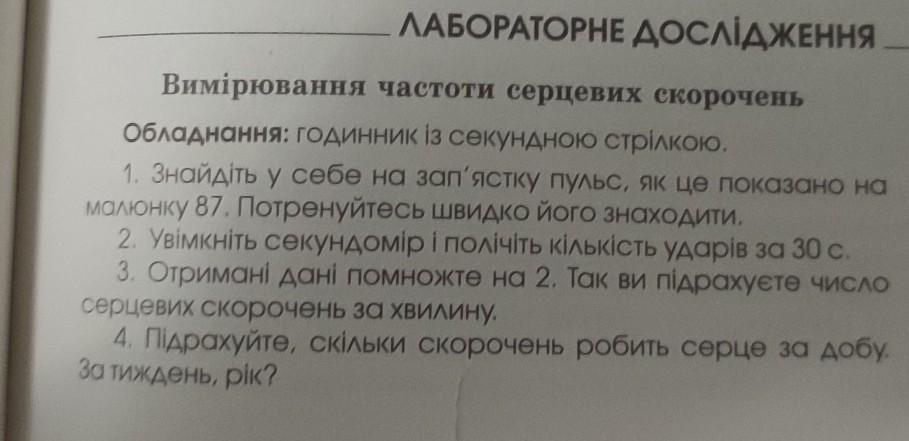 ЛАБОРАТОРНЕ ДОСЛІДЖЕННЯ Вимірювання частоти серцевих скорочень Обладнання: годинник із секундною стрілкою. 1. Знайдіть у себе на зап'ястку пульс, як це показано на малюнку 87. Потренуйтесь швидко його знаходити. 2. Увімкніть секундомір і полічіть кількість ударів за 30 с. 3. Отримані дані помножте на 2. Так ви підрахуєте число 4. Підрахуйте, скільки скорочень робить серце за добу. серцевих скорочень за хвилину. За тиждень, рік? альне аблення дсердь ночків