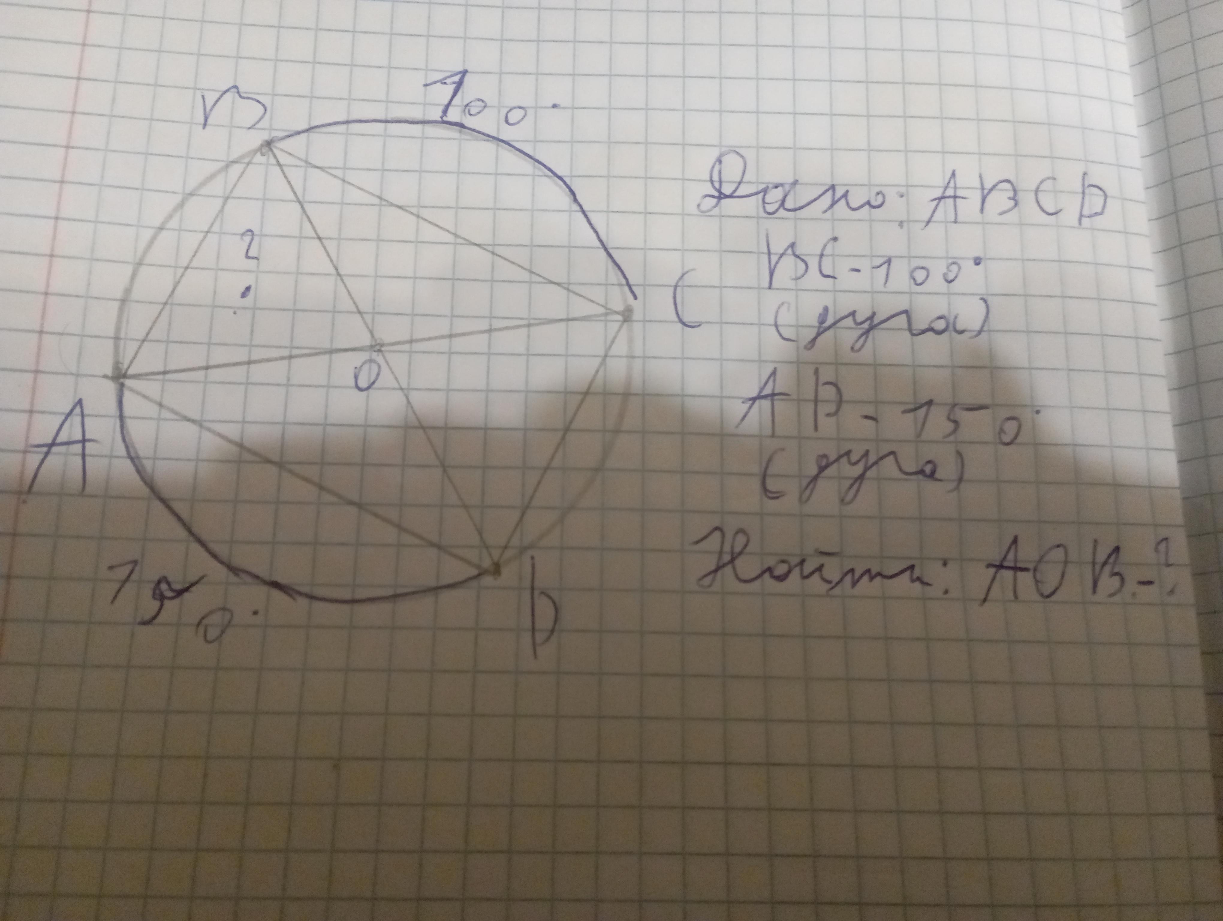 Дан вписанный в окружность произвольный четырехугольник ABCD. Проведены диагонали (центральный угол). Градусная мера дуги BC-100°, AD-150°. Найти градусную меру дуги AB (или же AOB).