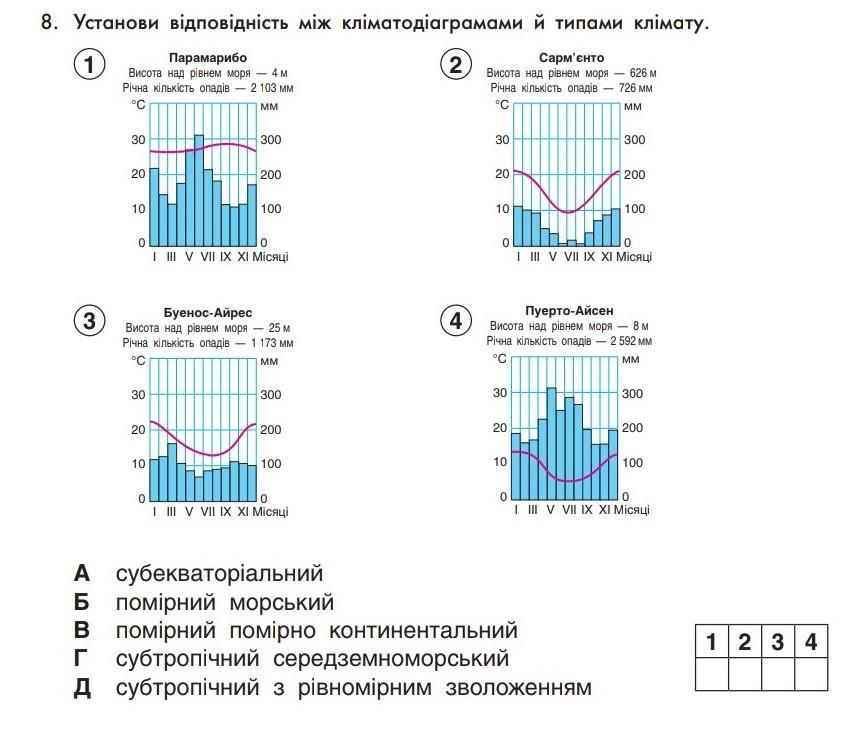 8. Установи відповідність між кліматодіаграмами й типами клімату. 1) 2 Парамарибо Висота над рівнем моря - 4 м Рiчна кiлькiсть опадів - 2 103 мм Сарм'єнто Висота над рівнем моря - 626 м Річна кількість опадів - 726 мм °C °℃ MM MM 3 30 20 10 0 30 20 10 300 Буенос-Айрес Висота над рівнем моря - 25 м Рiчна кiлькiсть опадів - 1 173 мм °C MM 0 200 100 0 I III V VII IX XI Мiсяцi 300 200 100 0 I III V VII IX XI Мiсяцi V 4 30 20 10 0 30 20 10 300 Пуерто-Айсен Висота над рівнем моря - 8 м - Рiчна кількість опадів - 2 592 мм °℃ MM 200 100 0 I III V VII IX XI Мiсяцi А субекваторіальний Б помірний морський в помірний помірно континентальний Г субтропічний середземноморський Д субтропічний з рівномірним зволоженням 300 200 100 0 0 I III V VII IX XI Мiсяцi 1 2 3 4 8/8