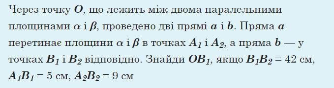 Через точку О, що лежить між двома паралельними площинами а і В, проведено дві прямі а і в. Пряма а перетинає площини а і в в точках А₁ і А₂, а пряма b -y точках В1 і В2 відповідно. Знайди ОВ₁, якщо В1В2 = 42 см, А1В1 = 5 см, А2В₂ = 9 см