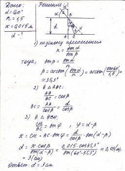 Намалювати хід променя який падає з повітря на скляну пластинку під кутом 60градусів. показати його зміщення при виході з пластики .