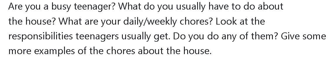 Yes, I am a busy teenager. I typically have various responsibilities around the house that contribute to my daily and weekly routine. One of my regular chores is to keep my room tidy by organizing and cleaning it. This not only helps me maintain a neat personal space but also instills a sense of responsibility. For instance, I make my bed every morning, ensuring a clean and organized living environment.