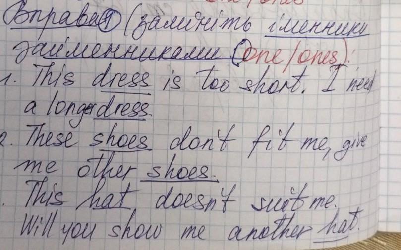 Ответ: 1) This dress is too short. I need a longer one. 2) These shoes don't fit me, give me other ones. 3) This hat doesn't suit me. Will you show me another one?