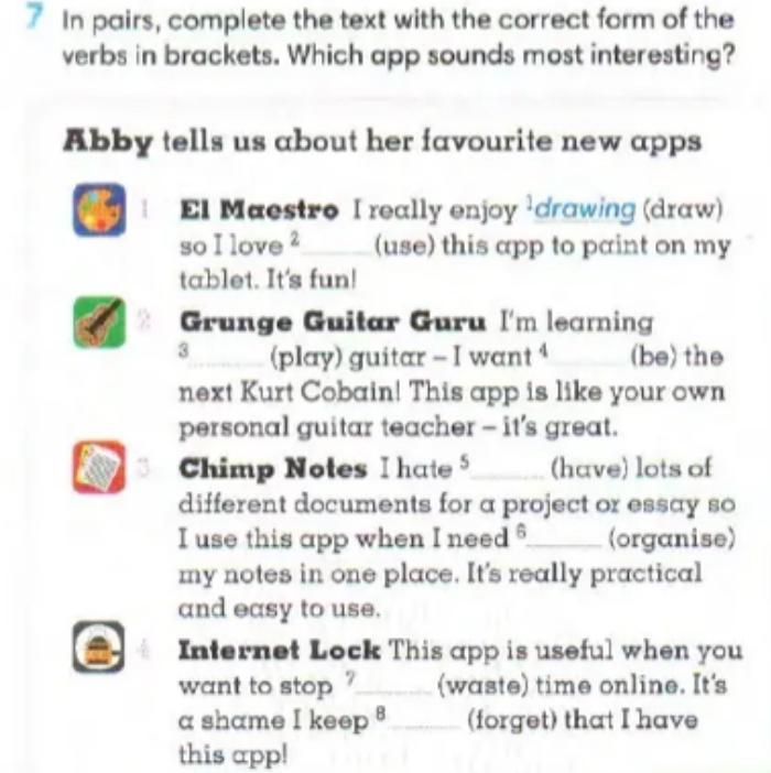 2.using, 3.how to play, 4.to be, 5.having, 6.to organize, 7.wasting, 8.forgetting.