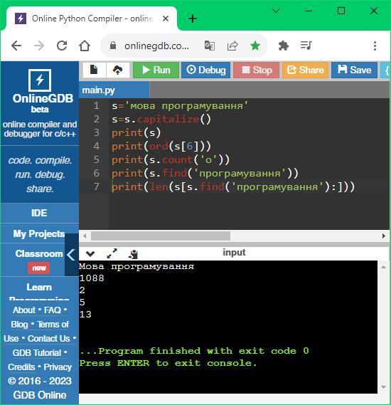 Дано рядок: «мова програмування». Замінити першу букву рядка на велику, визначити код букви на 7-ій позиції, кількість букв «о» у рядку, позицію, з якої починається слово «програмування» і кількість букв у цьому слові.