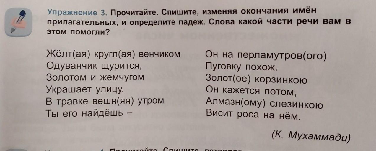Упражнение 3. Прочитайте. Спишите, изменяя окончания имён прилагательных, и определите падеж. Слова какой части речи вам в этом помогли? Жёлт(ая) кругл(ая) венчиком Одуванчик щурится, Золотом и жемчугом Украшает улицу. В травке вешн(яя) утром Ты его найдёшь — Он на перламутров(ого) Пуговку похож. Золот(ое) корзинкою Он кажется потом, Алмазн(ому) слезинкою Висит роса на нём.