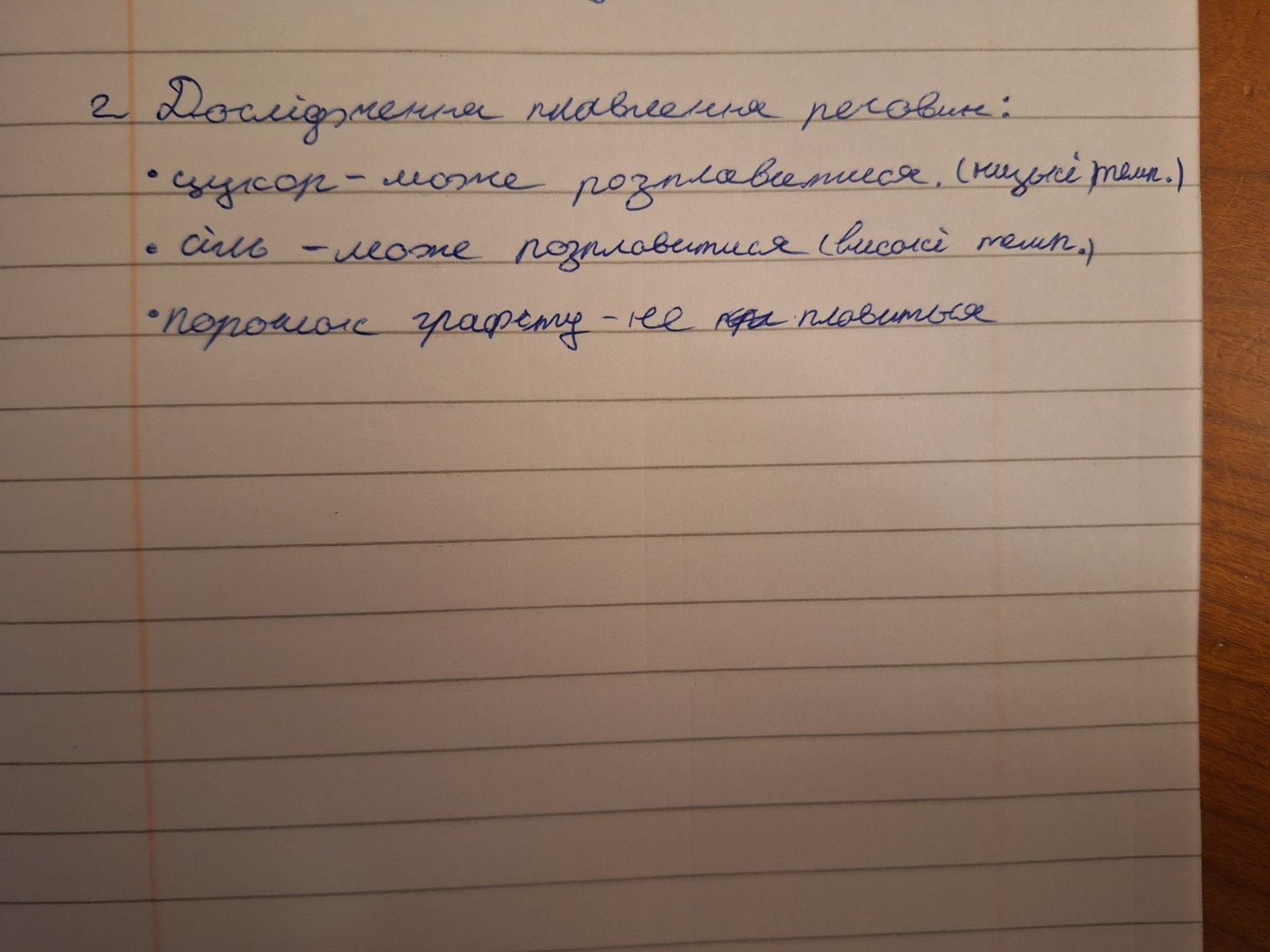 Дослідження плавлення речовин. Візьміть три металеві ложечки. Помістіть: у першу ложечку — половину шпателя цукру, у другу — половину шпателя кухонної солі, у третю — половину шпателя порошку графіту. Нагрівайте 1-2 хвилини в полум’ї спиртівки. Спостерігайте за здатністю речовин до плавлення