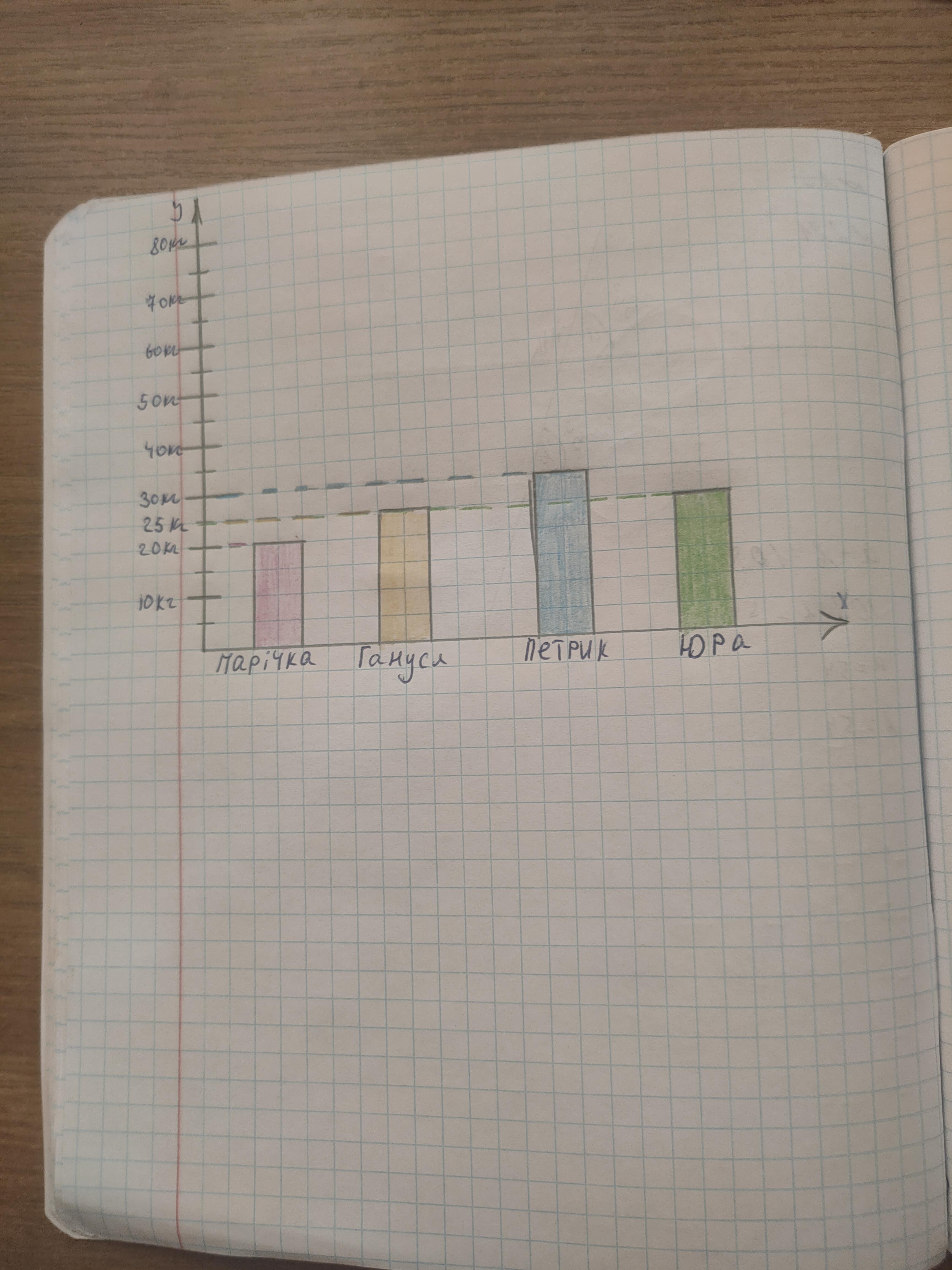 Марічка важить 20кг, Ганнуся 25кг, Петрик 30кг, Юрко 25кг. Покажи ці дані за допомогою стовпчастої діаграми. Для зображення 1кг візьми відрізок 1мм.