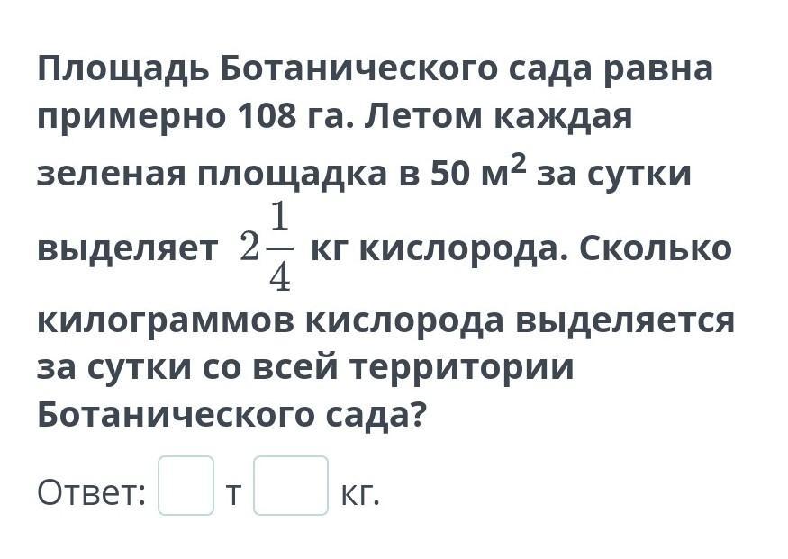 Площадь Ботанического сада равна примерно 108 га. Летом каждая зеленая площадка в 50 м² за сутки 1 выделяет 2— кг кислорода. Сколько 4 килограммов кислорода выделяется за сутки со всей территории Ботанического сада? Ответ: T кг. ответ в тоннах и килограммов!!!! пж