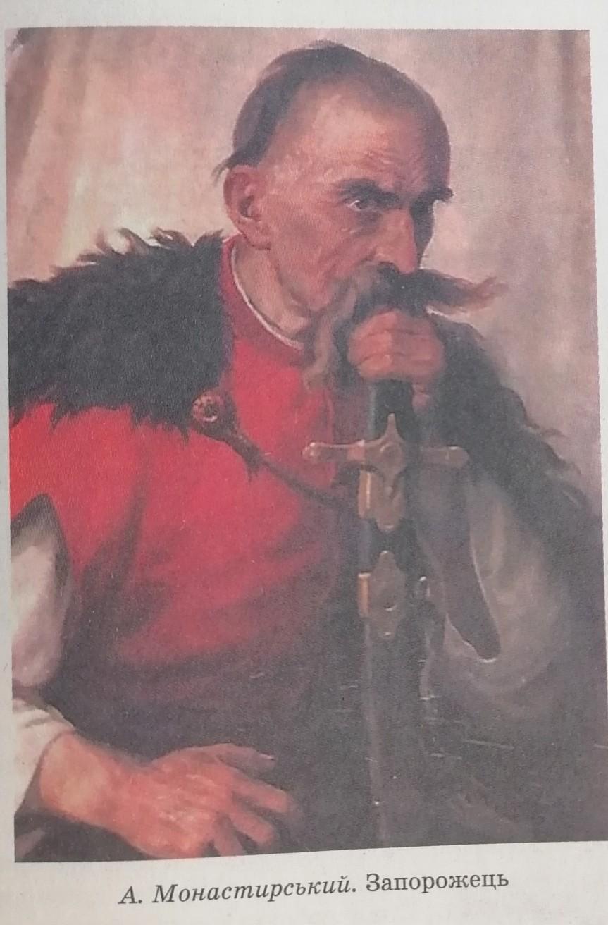Коли дивишся на запорожця на картині Монастирського, то перш за все починаєш пригадувати, чи бачив ти таких людей у житті: він здається небагатослівним і дуже незвичної зовнішності. Найбільше увага затримується на бритій голові і оселедцю. А потім вже помічаєш і пишні вуса, і козацьку шаблю, на яку оперся запорожець.