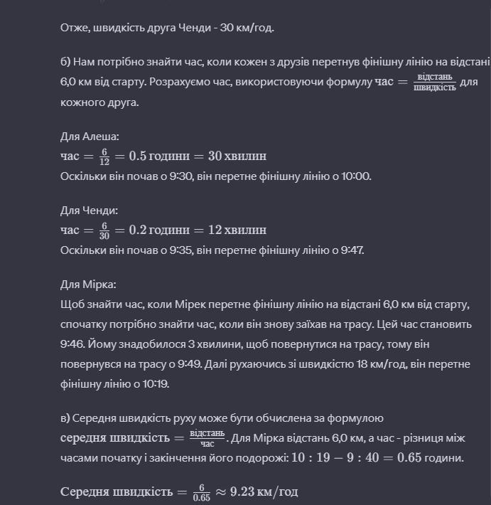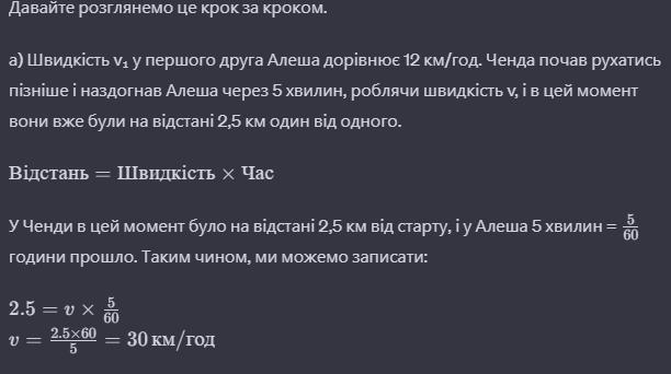 Троє друзів вправлялися в картингу на закритій трасі. Всі вони стартували з одного місця і в одному напрямку. Алеш першим вийшов на трасу о 9:30 ранку з постійною швидкістю vị = 12 км/год. О 9:35 ранку Ченда поїхав з постійною швидкістю v і наздогнав Алеша на відстані $1 = 2,5 км від старту. Мірек вийшов на трасу останнім о 9:40 ранку з постійною швидкістю vz = 15 км/год. Він зійшов з траси через 6 хвилин їзди, і йому знадобилося 3 хвилини, щоб повернутися на трасу. Потім він продовжив рух із постійною швидкістю a = 18 км/год. а) Обчисліть швидкість v2 Ченді. б) О котрій годині кожен із друзів перетнув фінішну лінію на відстані s = 6,0 км від старту? в) Обчислити середня швидкість Мірка на всій трасі.