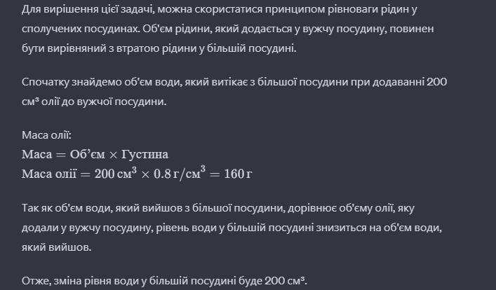 у сполученні посудинм з внутрішніми діаметрами 3 см і 7 см налили воду. визначити наскільки зміниться рівень води в посудині більшого діаметра, якщо у вужчу посудину налити 200см3 олії густиною 0,8 г/см3