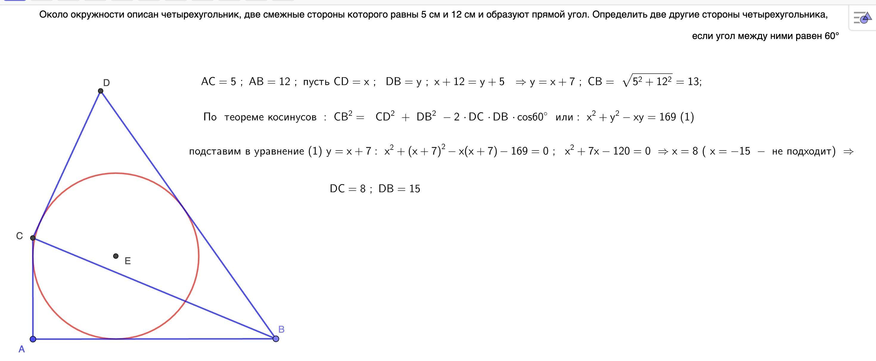 Около окружности описан четырехугольник, две смежные стороны которого равны 5 см и 12 см и образуют прямой угол. Определить две другие стороны четырехугольника, если угол между ними равен 60°