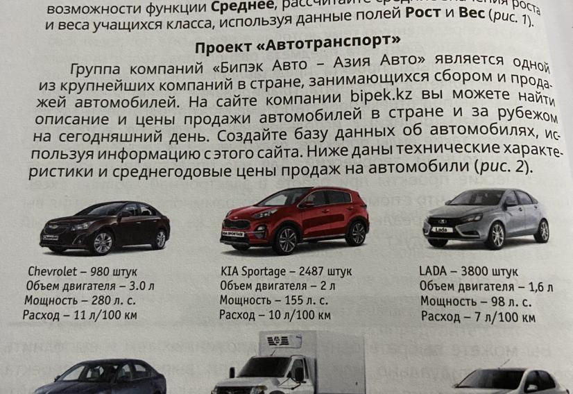 2. В базе данных в полях отразите наименования автомобилей, объем цилиндра, мощность, расход топлива на каждые 100 км и среднегодовые цены соответствующего автотранспорта.