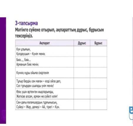 3-тапсырма Мәтінге сүйене отырып, ақпараттың дұрыс, бұрысын тексерiнiз. Дурыс Бурмс Акпарат Кун улымын, Қолдаушым - Күнім менің Биби Арманым биік менің Куннiн нуры ойына сiнiргенім Туғыр бердiн сен маган - елдi ойла деп, Сол туғырдан шығады унім менің! Өзiн ушiн ертенген жырларымды, Жеткізе алсам, арман не суйкті елім! Сен-дағы ғаламшардын тұрғынысын, Суйеуi - Жер, демеуі – Ай, тірегі – Күн.