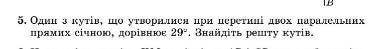 5. Один з кутів, що утворилися при перетині двох паралельних прямих січною, дорівнює 29°. Знайдіть решту кутів.
