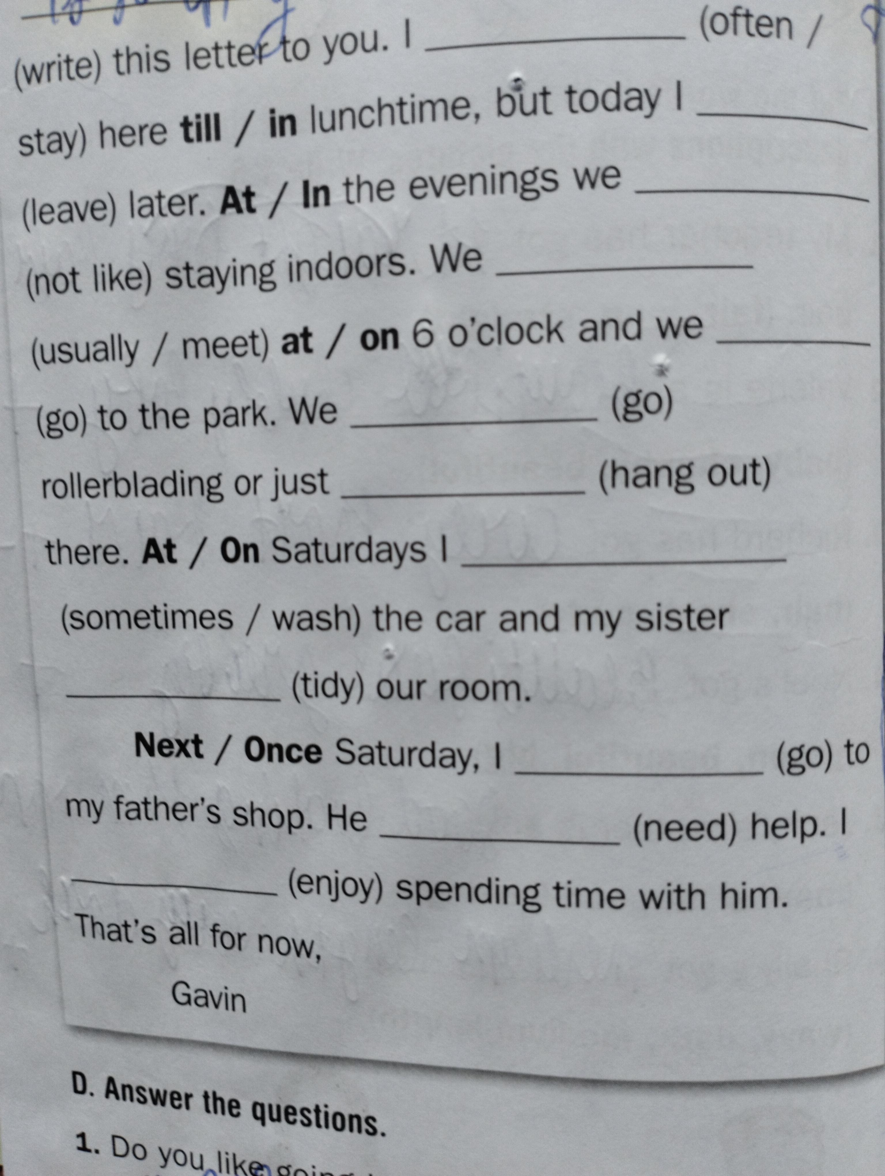 In the evenings we don’t like staying indoors. We usually meet at 6 o’clock and we go to the park. We go rollerblading or just hang out there. On Saturdays I sometimes wash the car and my sister tidies our room.