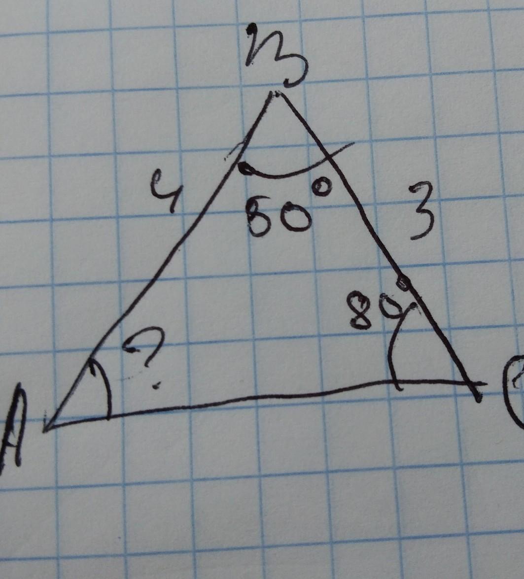 Угол А = 180 - 80 - 50° = 50°