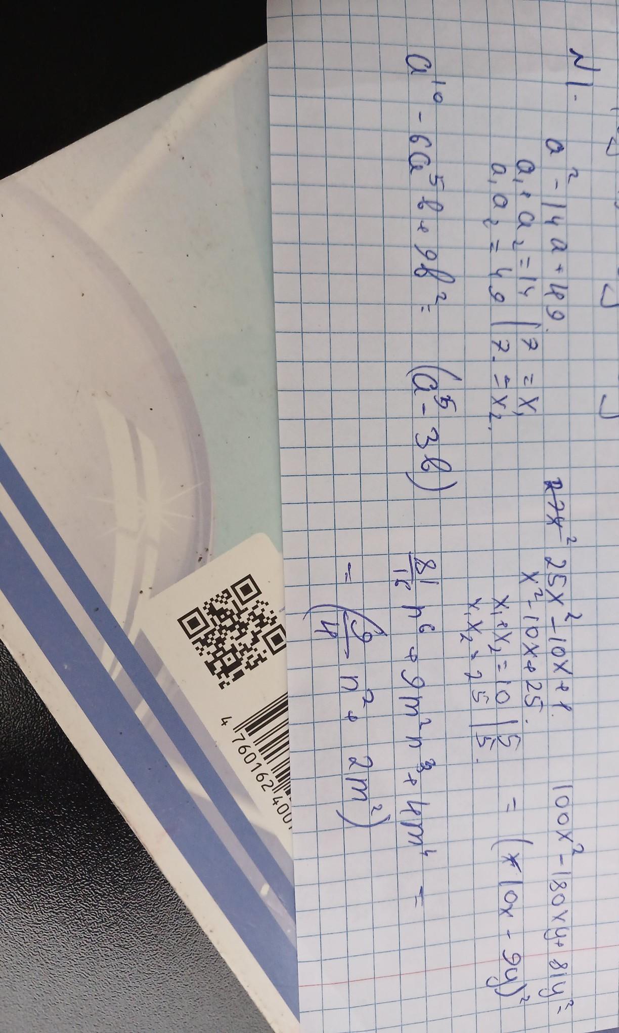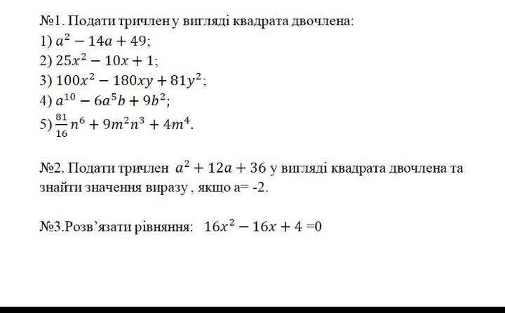 даю 75 балів№1. Подати тричлен у вигляді квадрата двочлена: 1) a² - 14a + 49; 2) 25х² - 10x + 1; 3) 100х² - 180xy +81y²; 4) a10 - 6a5b + 9b²; 81 5) { n© + 9m²n³ + 4m. 16 №2. Подати тричлен а² + 12а + 36 у вигляді квадрата двочлена та знайти значення виразу, якщо а=-2. No3. Pозв'язати рівняння: 16х2 - 16x + 4 =0