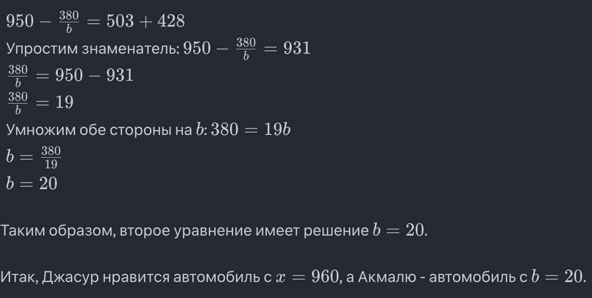 6. Решите уравнения и узнайте, какой автомобиль нравится Джасуру, а какой Акмалю. (x-720): 30 = 400 - 392 950 - 380 : b = 503 +428 19 960 20