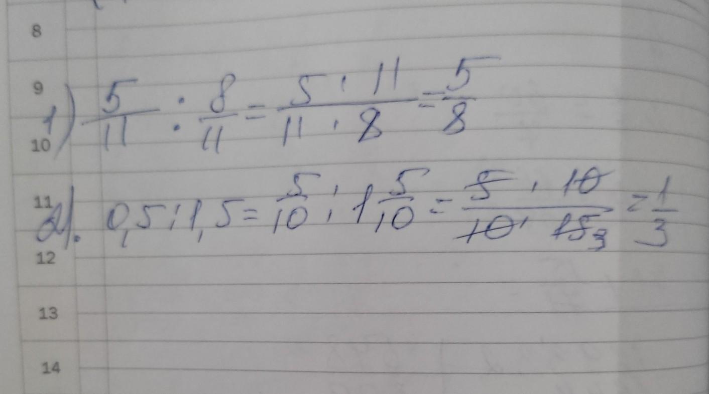Заміни відношення дробових чисел відношенням натуральних чисел 1) 5/11 : 8/11; 2) 0,5:1,5