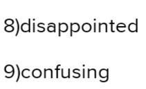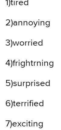 1) The students were very tired / tiring. 2) Teachers find it annoyed/annoying when students are late for class. 3) His parents are usually worried / worrying when he's late. 4) I heard a very frightened / frightening story. 5) Bermet was surprised / surprising to find a letter on her table. 6) The children were terrified/ terrifying when they heard a strange noise downstairs. 7) Horse riding can be an excited/exciting experience. 8) The boy was disappointed /disappointing by the test result. 9) When learning a new foreign language, grammar rules can be confused/confusing.