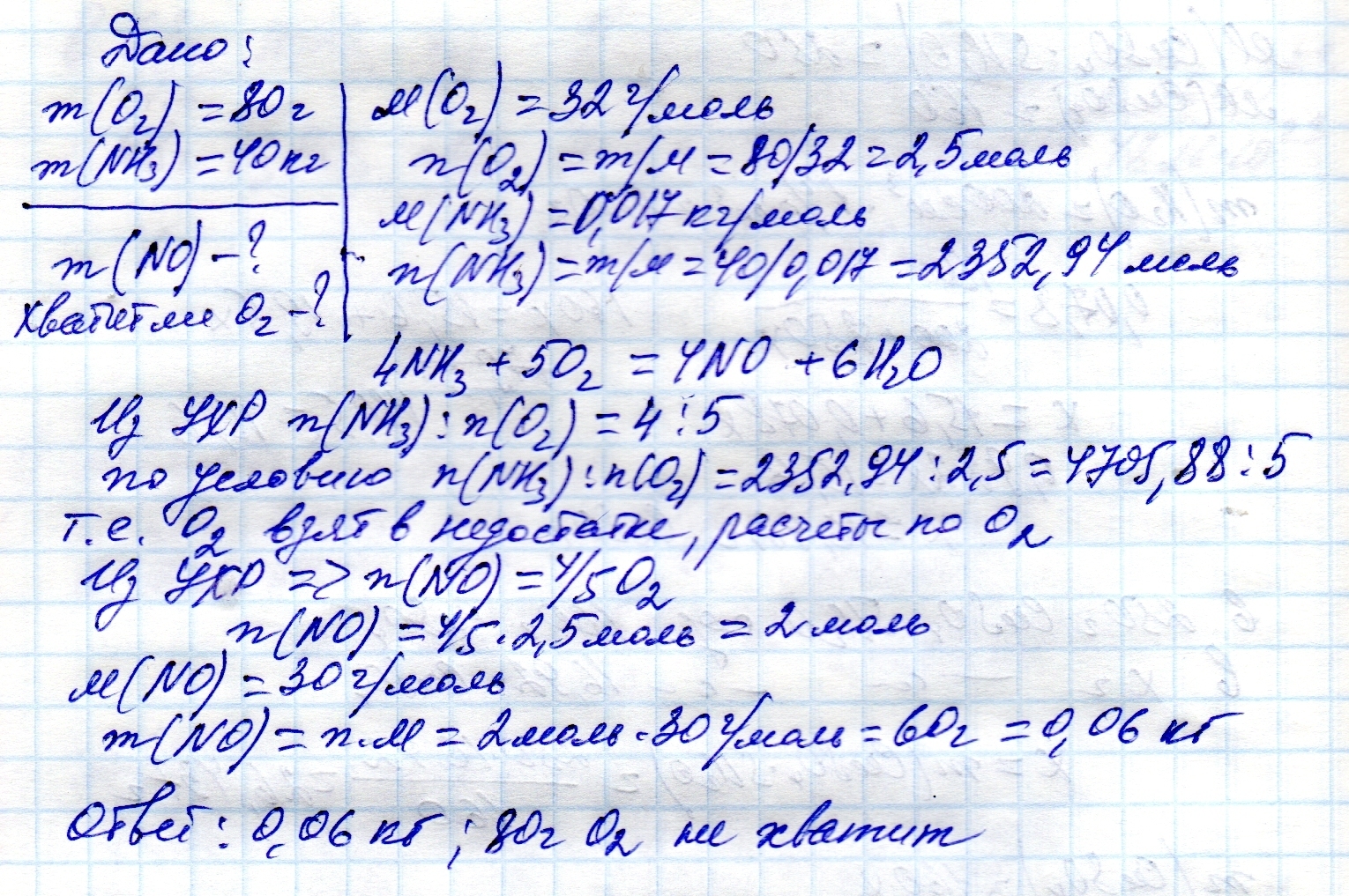 (На укр): Чи вистачить 80 г кисню для окиснення 40 кг аміаку?Скільки кілограмів нітроген (||) оксиду при цьому утвориться?