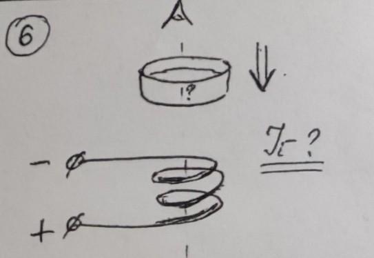 6) Визначити напрямок індукційного струму в металевому кільці, яке падає на котушку зі струмом.