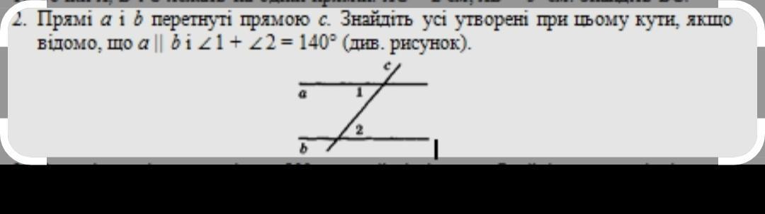 2. Прямі а і в перетнуті прямою с. Знайдіть усі утворені при цьому кути, якщо відомо, що а|| b Кут 1 + Кут 2 = 140°