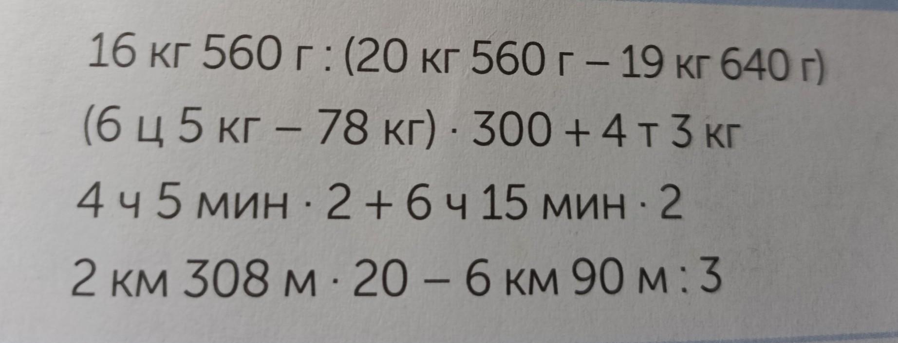 4 Вычисли.:16 кг 560 г : (20 кг 560 г - 19 кг 640 г) (6 ц 5 кг - 78 кг). 300 + 4 т 3 кг 4 ч 5 мин. 2 + 6 ч 15 мин. 2 2 км 308 м. 20- 6 км 90 м: 3 быстрее