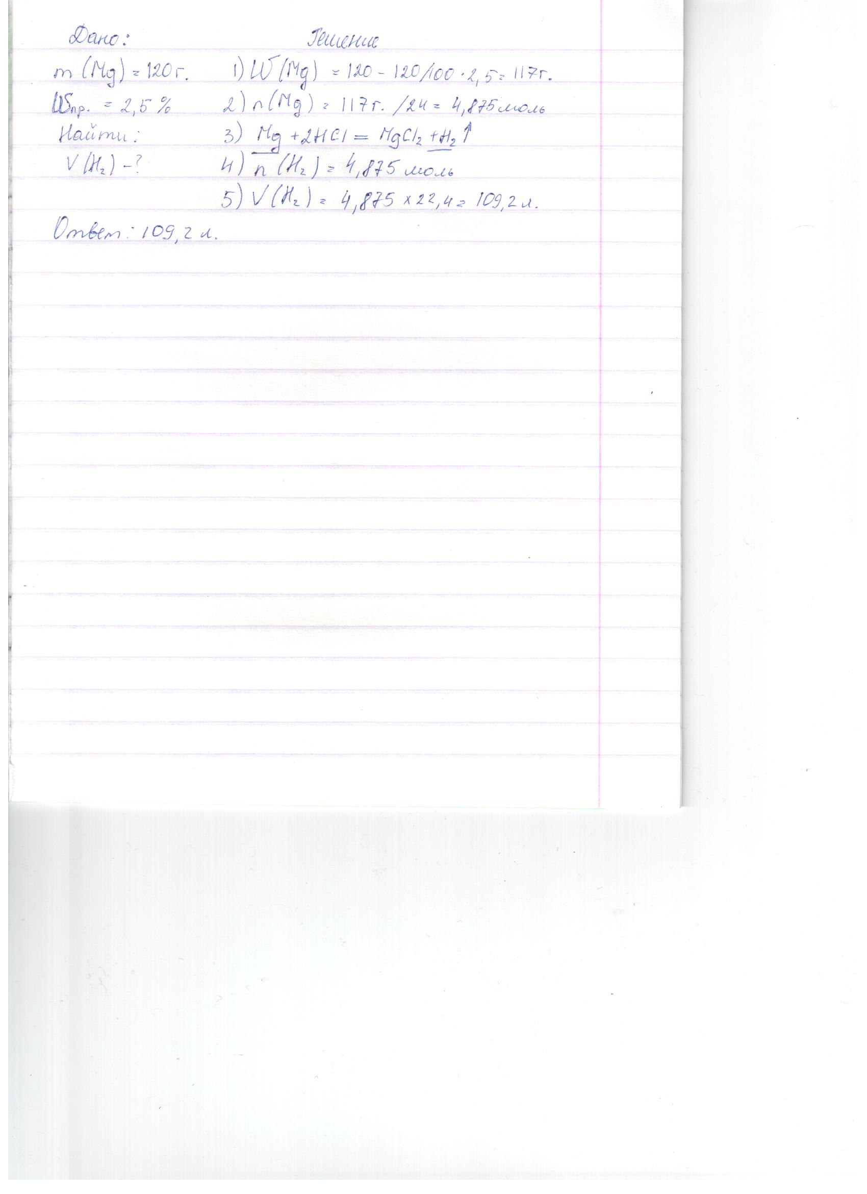 Рассчитайте объем водорода(н.у.), который выделится при растворении в соляной кислоте 120 г магния, содержащего 2.5% примесей.