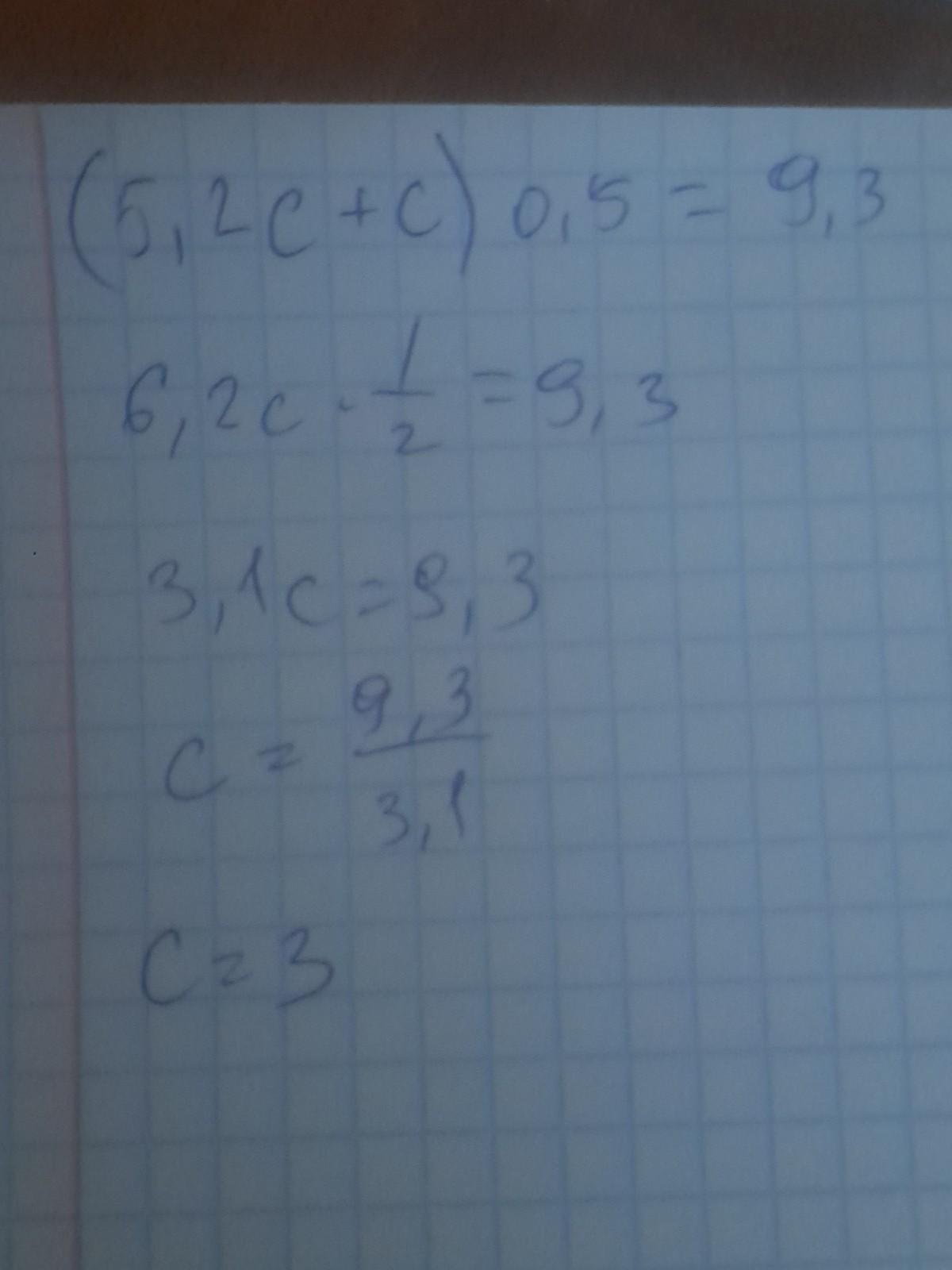 первую очередь добавляем c на 5.2с и потом превращаем 0.5 на 1 деленну 2 что бы было легче потом делим 6.2 на 2 и выходит 3.1 и потом переносим 3.1 на другую сторону она превращаеться на деления и 9.3 делить на 3.1 выходит 3