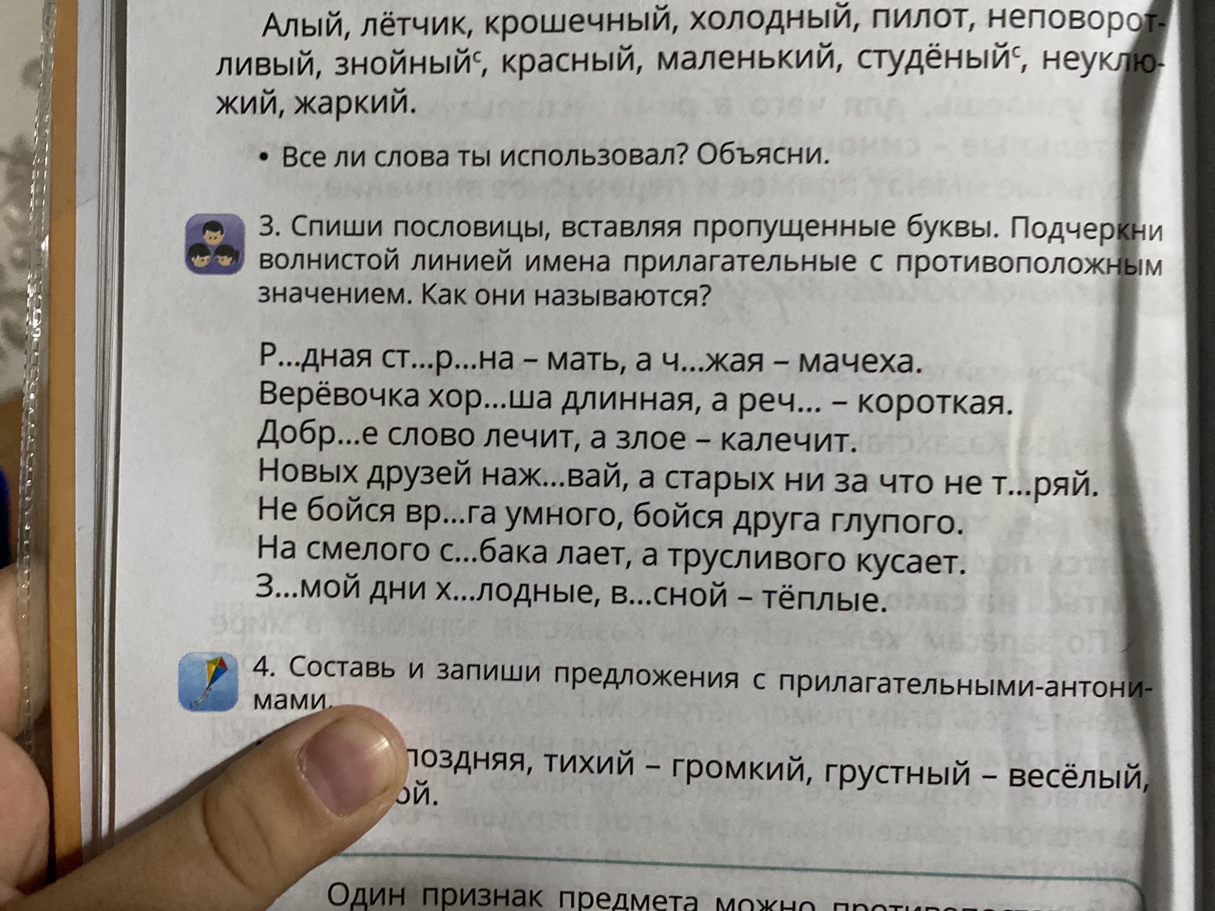 3.Спиши пословицы, вставляя пропущенные буквы. Подчеркни волнистой линией имена прилагательные с противоположным значением.