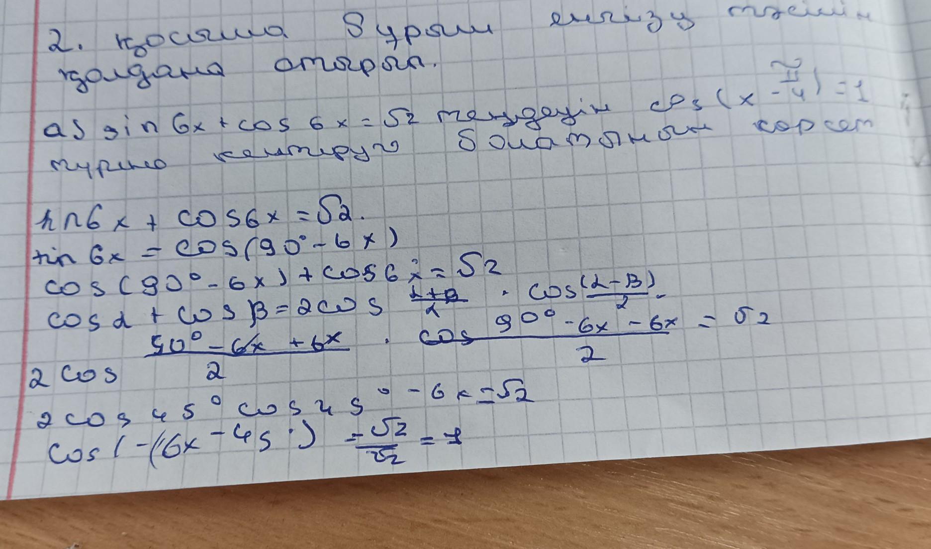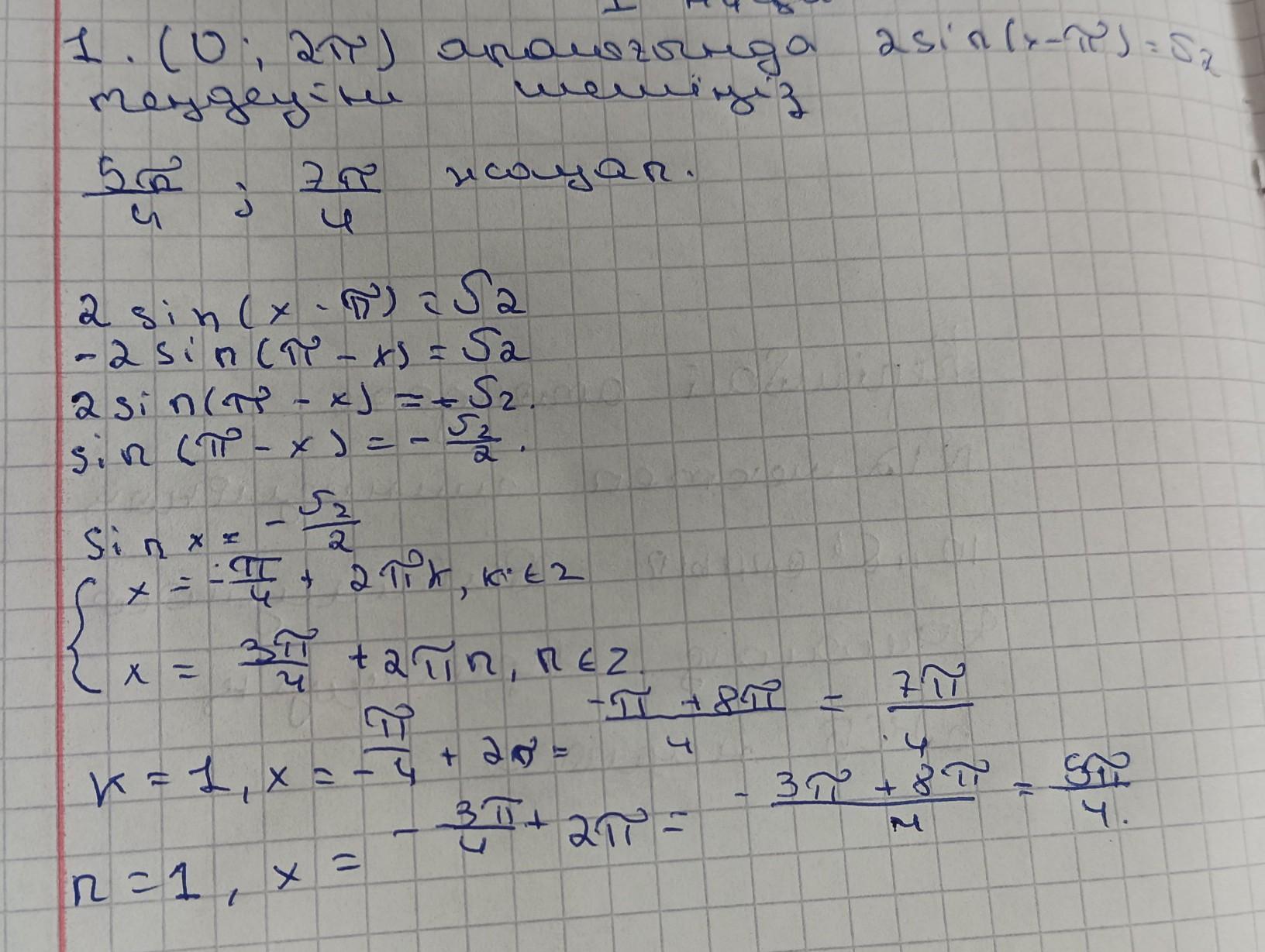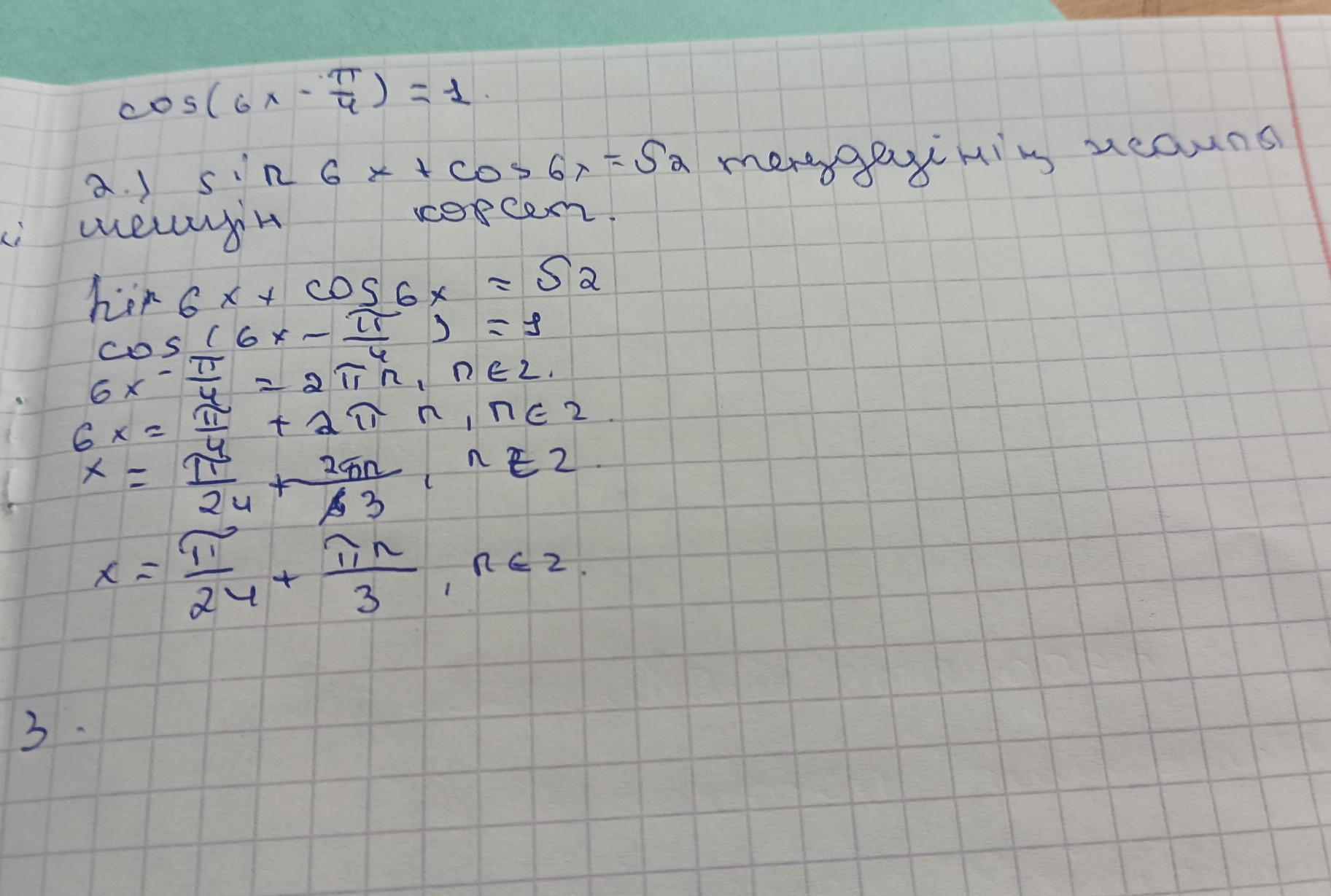 1. (0; 2п) аралығында 2sin (x - п) = √2 теңдеуін шешіңіз. 2. Қосымша бұрыш енгізу тәсілін қолданып, a) sin 6x + cos 6x = √2 теңдеуін cos (x - -7)=1 түріне келтіруге болатынын көрсетіңдер; ǝ) sin 6x + cos 6x = √2 теңдеуінің жалпы шешуін көрсетіңдер. 3. Тендеуді шешiндер: tgx =+√3. 4. Теңдеуді шешіңдер: sin 2x - sin2x =3 cos 2 x