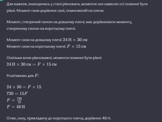 плеча прикладено у вертикальному напрямку силу 24 Н. Яку силу прикладено у вертикальному напрямку до коротшого плеча? Масою важеля можна знехтувати