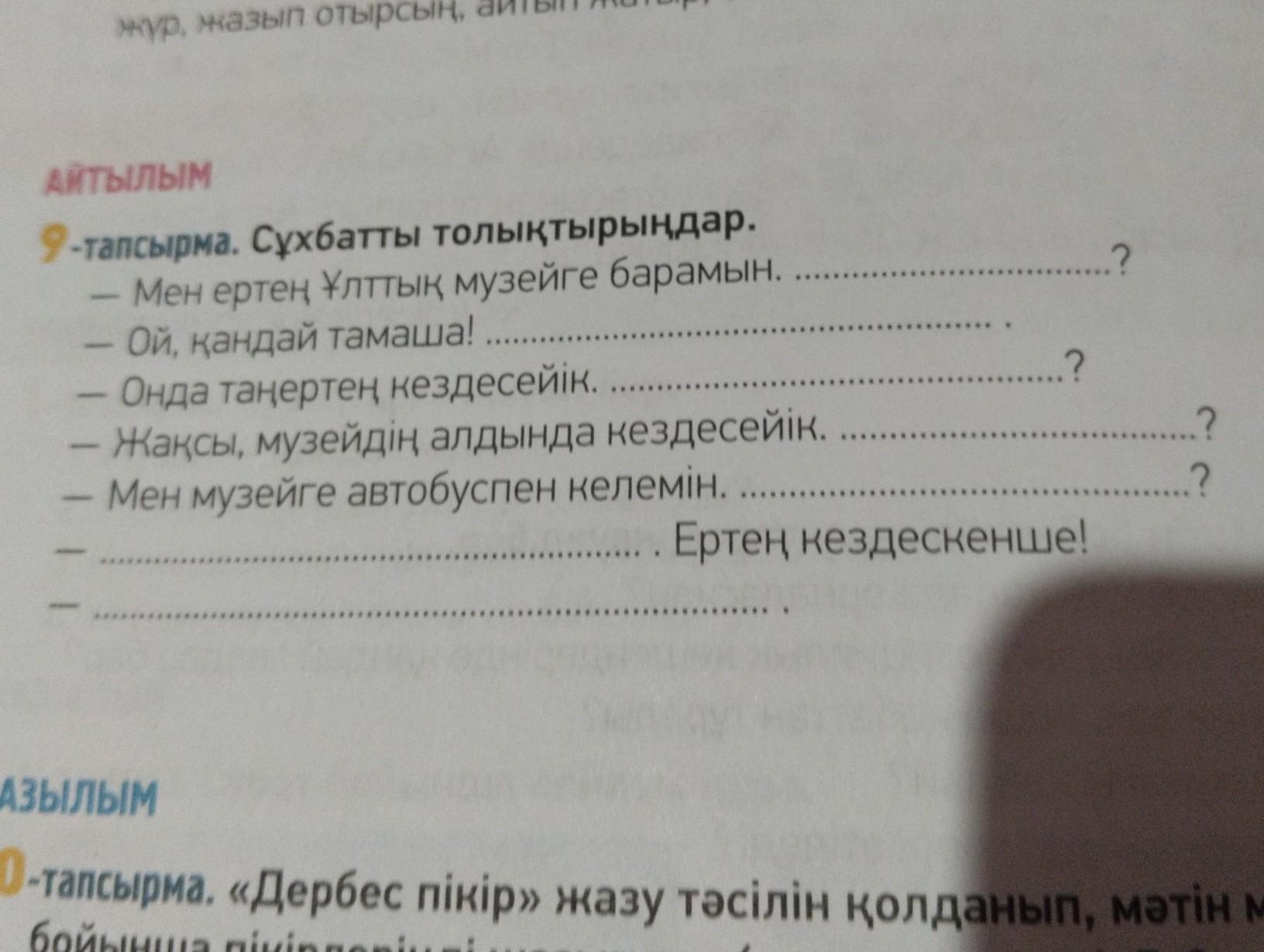 ПОМОГИТЕ ДАМ 100 БАЛЛОВ!!! АЙТЫЛЫМ 9-тапсырма. Сұхбатты толықтырыңдар. Мен ертең Ұлттық музейге барамын. Ой, кандай тамаша! - Онда таңертең кездесейік. Жақсы, музейдің алдында кездесейік. Мен музейге автобуспен келемін. ? Ертең кездескенше! ? .? ..?