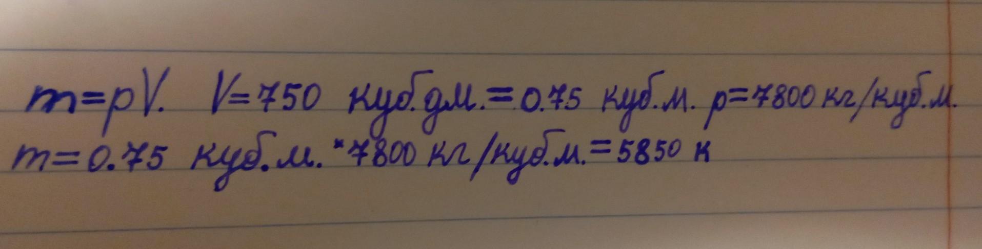 m=pV. V=750 куб.дм.=0.75 куб.м. p=7800кг/куб.м. m=0.75 куб.м.*7800 кг/куб.м.=5850 к