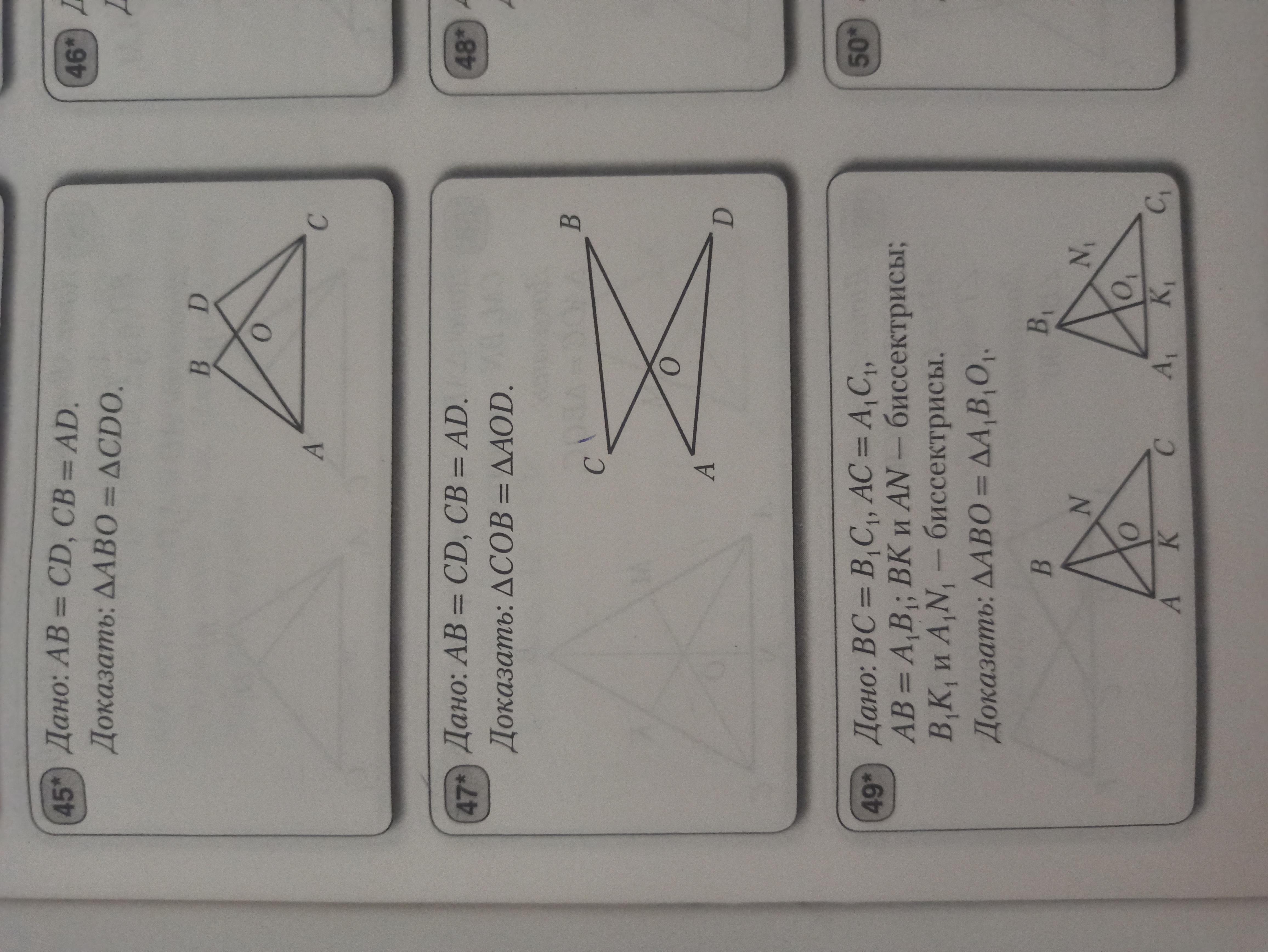 дано : AB=CD ці сторони рівні тому ми можемо сказати що кут BOC I APD вертикальні , якщо ми знаємо що вони вертикальні то сторони при перетині теж будуть рівні тому CO=OA BO=OD , за третьою ознакою рівності трикутників ми дізнаємось що трикутник COB=AOD тому що ми знаємо що третя ознака рівності трикутників - це коли три сторони рівні А ми довели що 1 CO=OA BO=OD і за умовами сказано що CB=AD==