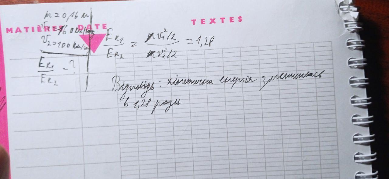 Шайба рухаючись по льоду змінила свою швидкість з 160 км/год до 100 км/год (перед відбиттям воротаря). Як змінилась кінетична енергія шайби? Маса шайби 160 г