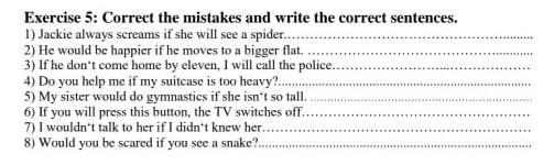 Exercise 5: Correct the mistakes and write the correct sentences. 1) Jackie always screams if she will see a spider.... 2) He would be happier if he moves to a bigger flat. 3) If he don't come home by eleven, I will call the police.. 4) Do you help me if my suitcase is too heavy?...... 5) My sister would do gymnastics if she isn't so tall. 6) If you will press this button, the TV switches off.. 7) I wouldn't talk to her if I didn't knew her... 8) Would you be scared if you see a snake?..
